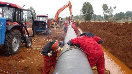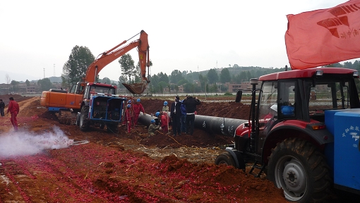 云峰分公司φ720供水管道安裝工程起點洋過水庫,止點河西泵站,全長4616米。沿山坡、水田地敷設;地形較復雜,設備進場較難。線路共有46個彎頭、2個閥門、1個流量器、6處河流(水渠)跨越、1處穿越。管道安裝工程在總公司各職能部門和云峰分公司的大力支持下,項目經理薛景華同志以身作則,帶領員工克服管材倒運進場難、天氣多雨等重重困難;從鋼管的采購,防腐到安裝、保質、保量、保安全、提前15天完成了施工任務,受到建設單位的好評。