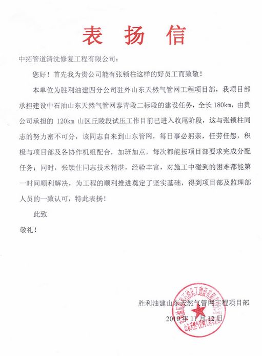 勝利油建濰坊項目表揚信 (圖)