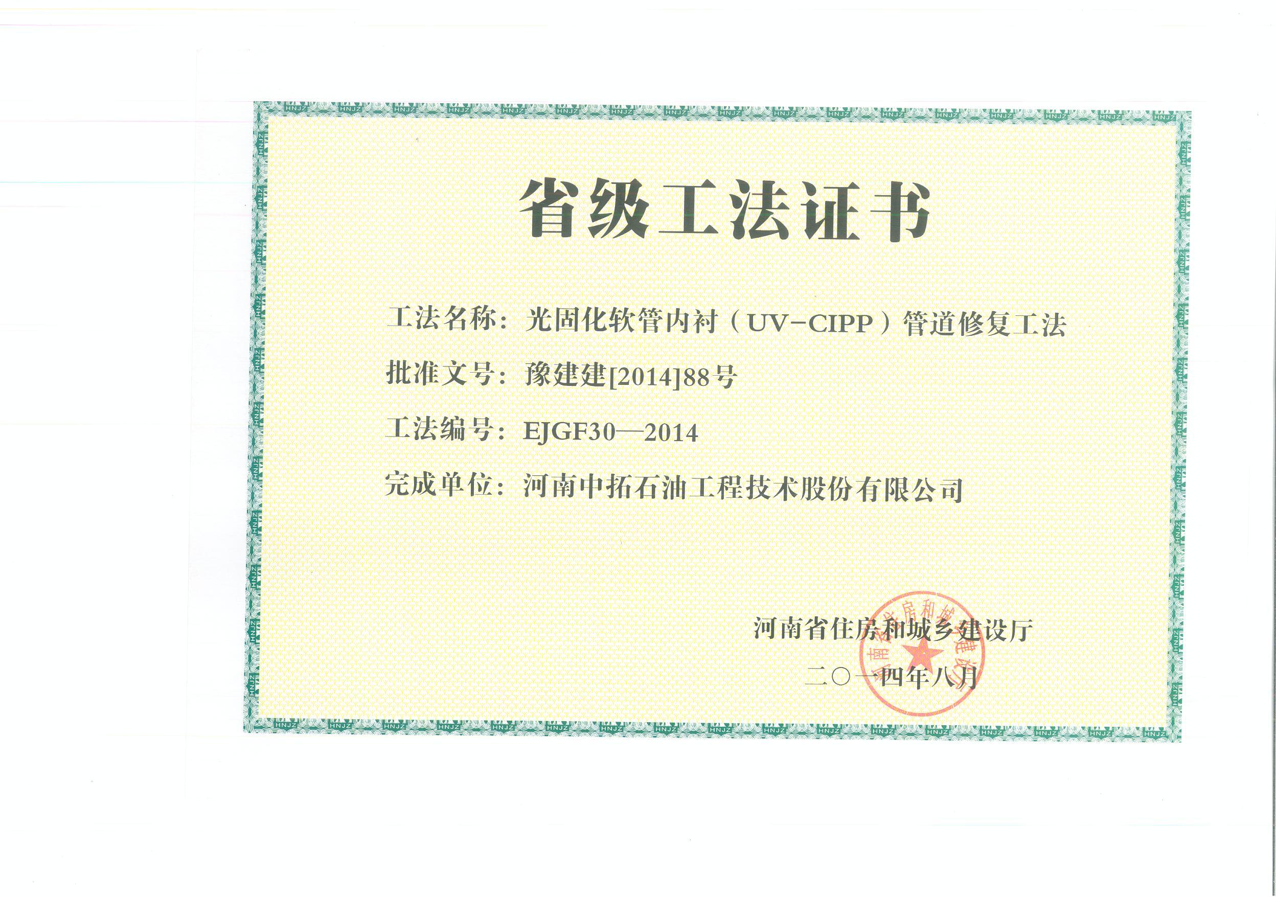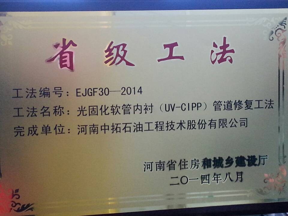 經河南省住房和城鄉建設廳組織專家委員會評選、評委會審議并經網上公示,我公司獲得一項河南省省級工法,工法名稱為“光固化軟管內襯(UV-CIPP)管道修復工法”。上述工法的獲得,表明公司的科研成果得到了政府部門的充分肯定和認可,展示了公司管道修復的科研實力,同時為今后繼續申報國家級工法做好準備,為申報政府科研項目、科技品牌建設再添科研成果奠定基礎。