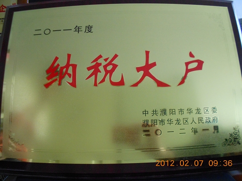 2012年1月10日,濮陽市華龍區表彰了十大納稅大戶,公司有幸獲得這個獎勵,是政府對公司的納稅工作的肯定,是公司誠信納稅的體現、是全體員工共同努力的結果、是全體中拓人的光榮。