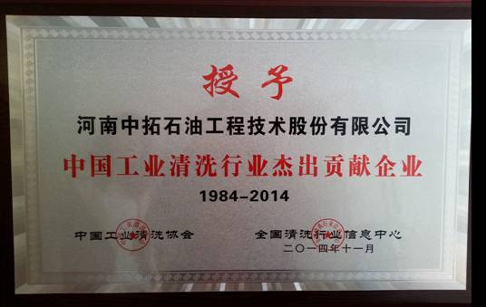 在2014年11月14日結(jié)束“第十四屆全國清洗行業(yè)技術(shù)進(jìn)步與清潔產(chǎn)業(yè)發(fā)展論壇”中,公司榮獲“中國工業(yè)清洗30年梯隊(duì)建設(shè)優(yōu)秀企業(yè)”和“中國工業(yè)清洗行業(yè)30年杰出貢獻(xiàn)企業(yè)”獎牌。