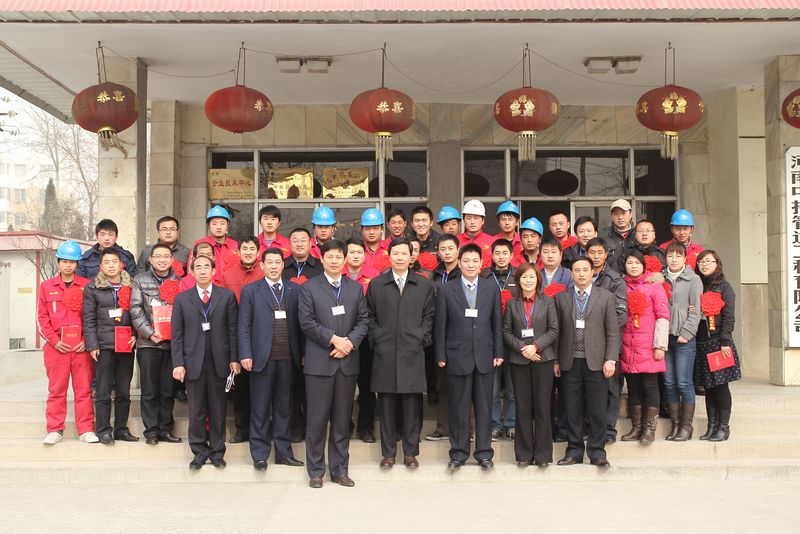 葛延超總工程師為獲得“先進項目部”的山東管網濰坊試壓項目部、安慶試壓、干燥、置換項目部、大同自來水穿插修復項目部、蘇丹六區稀油分輸管道安裝項目部、宣威管道安裝項目部、深圳穿越項目部代表辦法榮譽證書和獎金并合影留念: