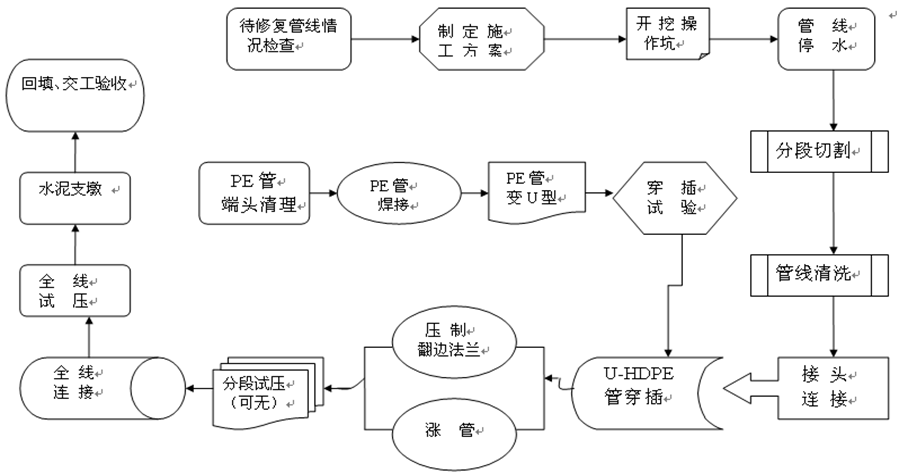 U-Shape Lining Repair Technology is to use HDPE pipeline of smaller diameter,shape it into U with deforming equipment, and then tie it to make small its diameter,then use a pulling machine to place the U-HDPE into the target pipeline,and restore it to the original size with water or soft pigs.In this way the U-Shape pipeline will adhere closely to the inner wall,forming an cmposite structure of Pipe in Pipe as an anti-corrosion coating.