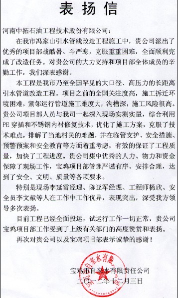 Baoji Project department of my company, comprehensive utilization of PE the interludes and stainless steel lined repair and optimize the construction program, and to overcome the technical difficulties, and good early warning plan, effective protection of the quality of the project and progress. Now the commission of the project is running smoothly, the work of Baoji project has received the unanimous affirmation and appreciation from the Baoji City Water Co. Ltd.