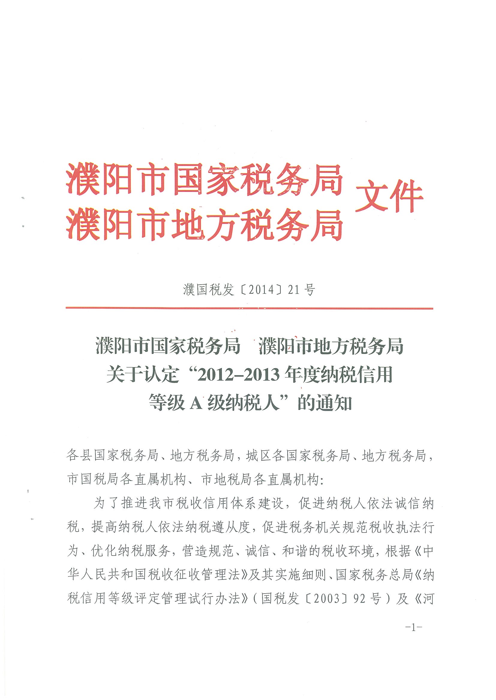 In April, 2014, Puyang Internal Revenue Service and Local Tax Bureau affirmed the ”Grade A taxpayers in Taxpaying Credit Rating from 2012 to 2013” and our company successfully won the honorary title of ”Grade A taxpayer in Taxpaying Credit Rating”.
