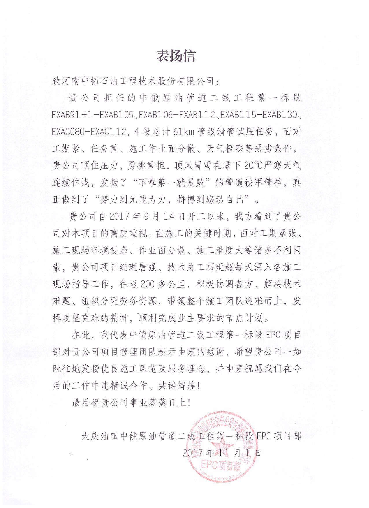 Since the project was launched in June, 2017, face the harsh conditions such as large span of construction, lack of water, scattered construction work and extremely cold weather etc, all the project staffs work together under the leadership of technical engineer Ge Yanchao, and project manager Tang Xin and He Xincai, to work with sincere cooperation, day and night fighting hard to overcome the difficulties, fighting snowstorm, complete the construction tasks excellently. The first and fourth tenders have been highly praised from the owners. All the staffs in the project can respond promptly to each construction, organize meticulously, manage scientifically and construct civilizedly so as to realize standardized management on site. This not only shows the good tradition of our company and the good features of staffs, but also fully embodies and develops "The spirit of Zhongtuo", but also add luster for the national petroleum pipeline construction .